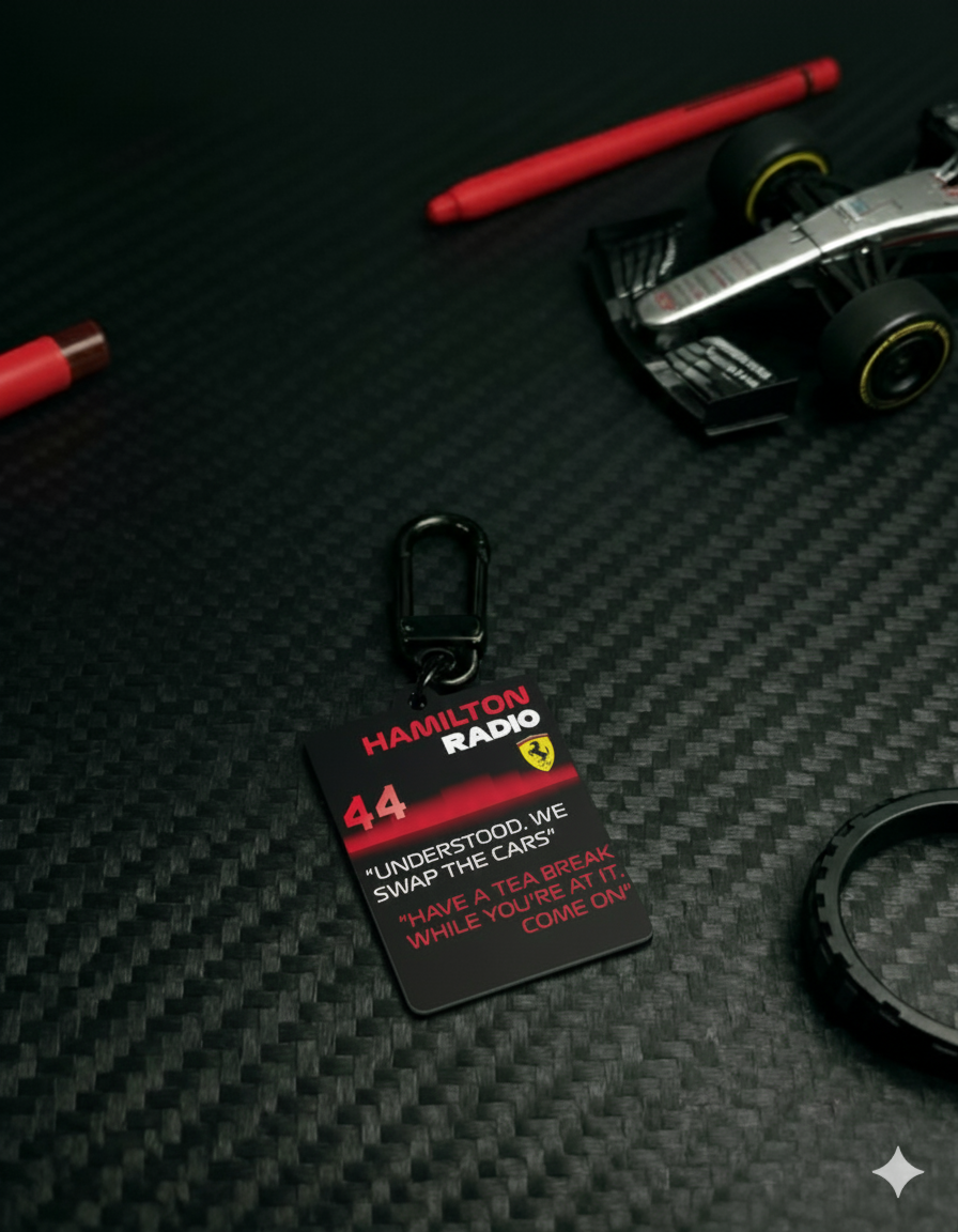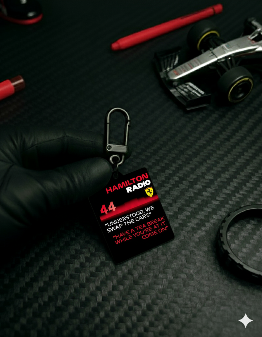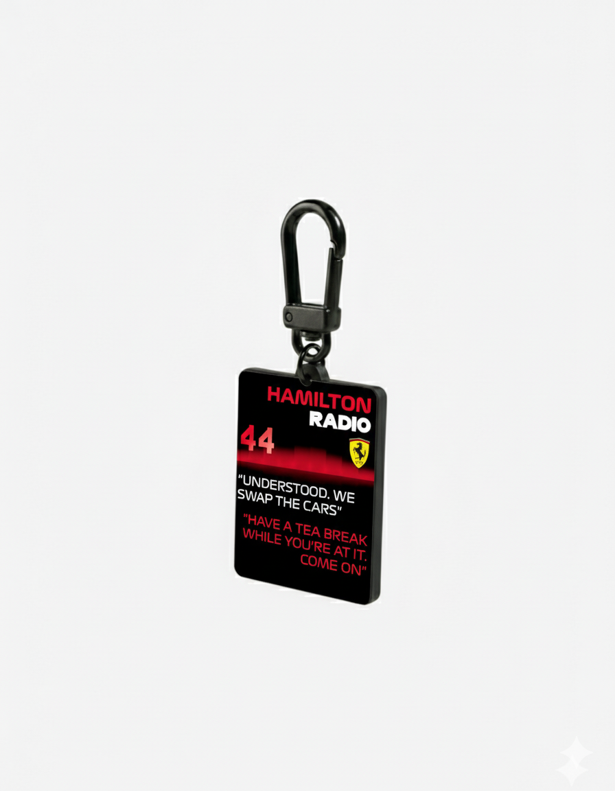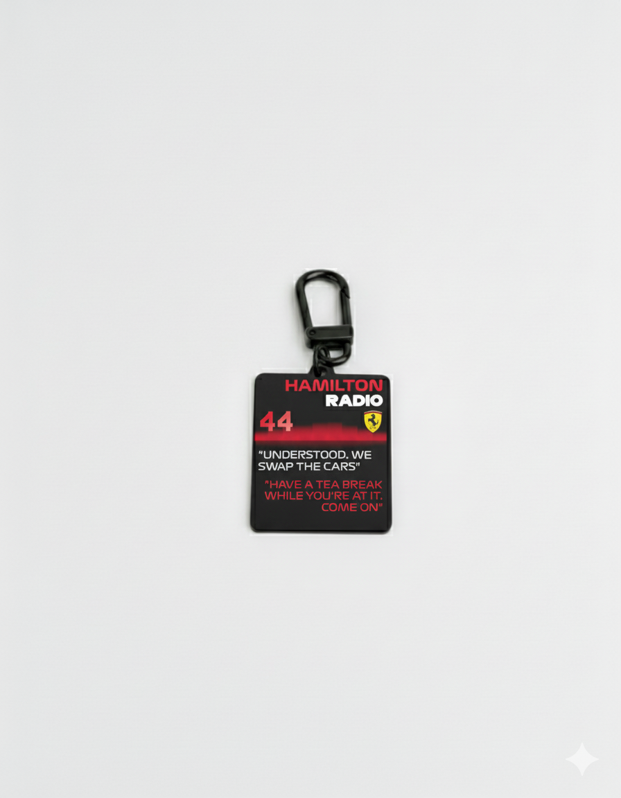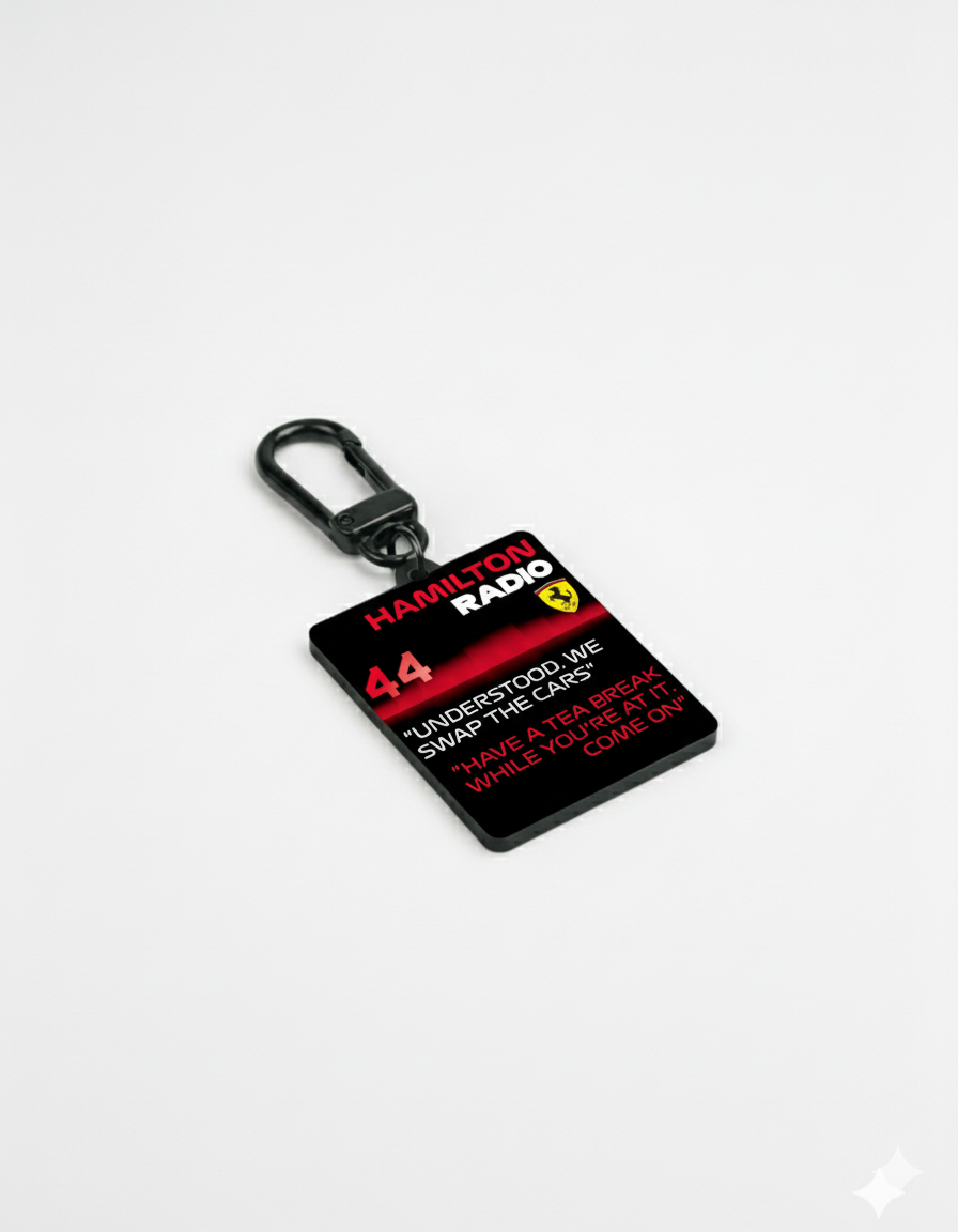 Capture Hamilton’s sharp race craft going full brit with this keychain quoting “Have a tea break while you’re at it. Come on.”
