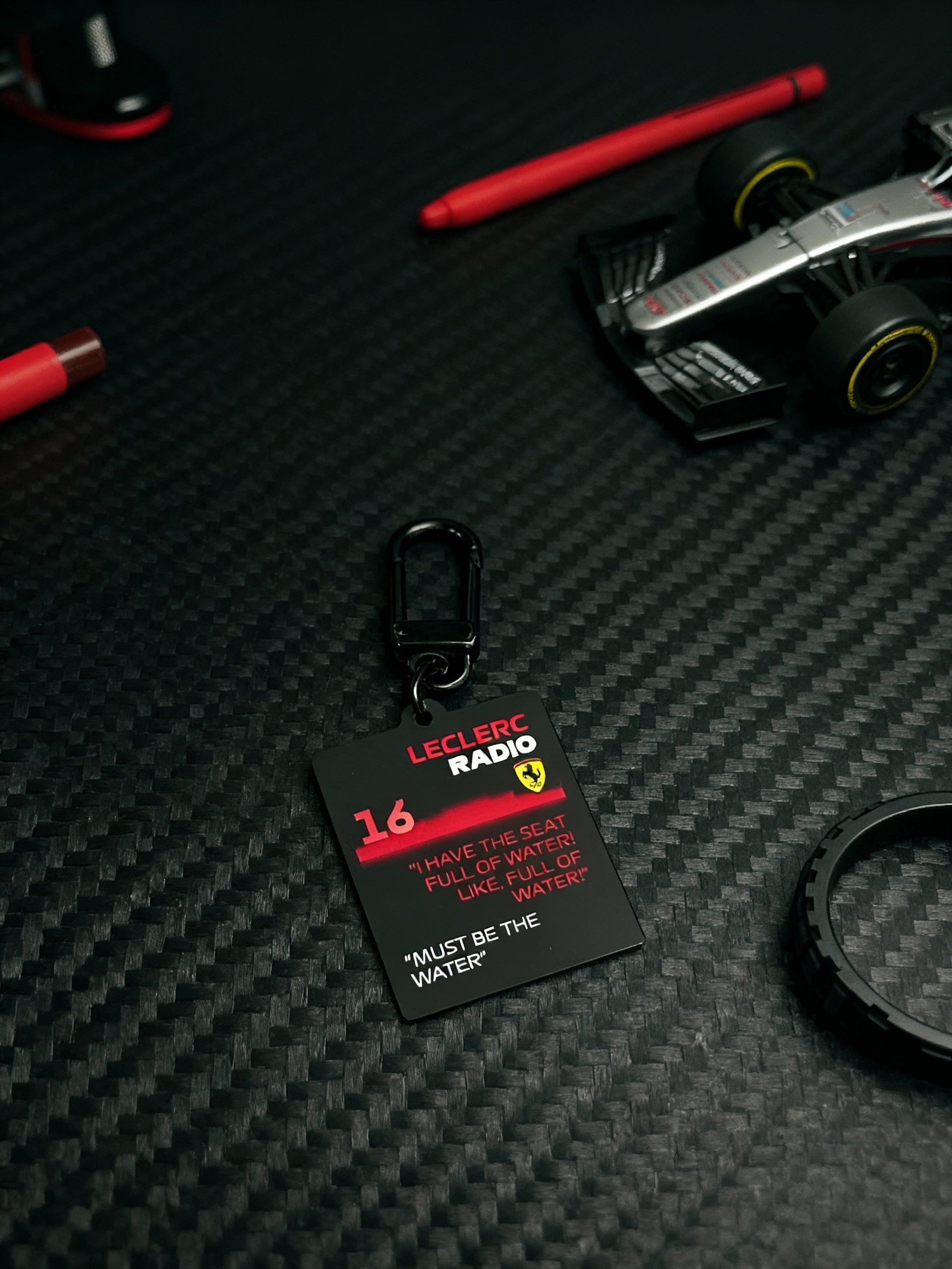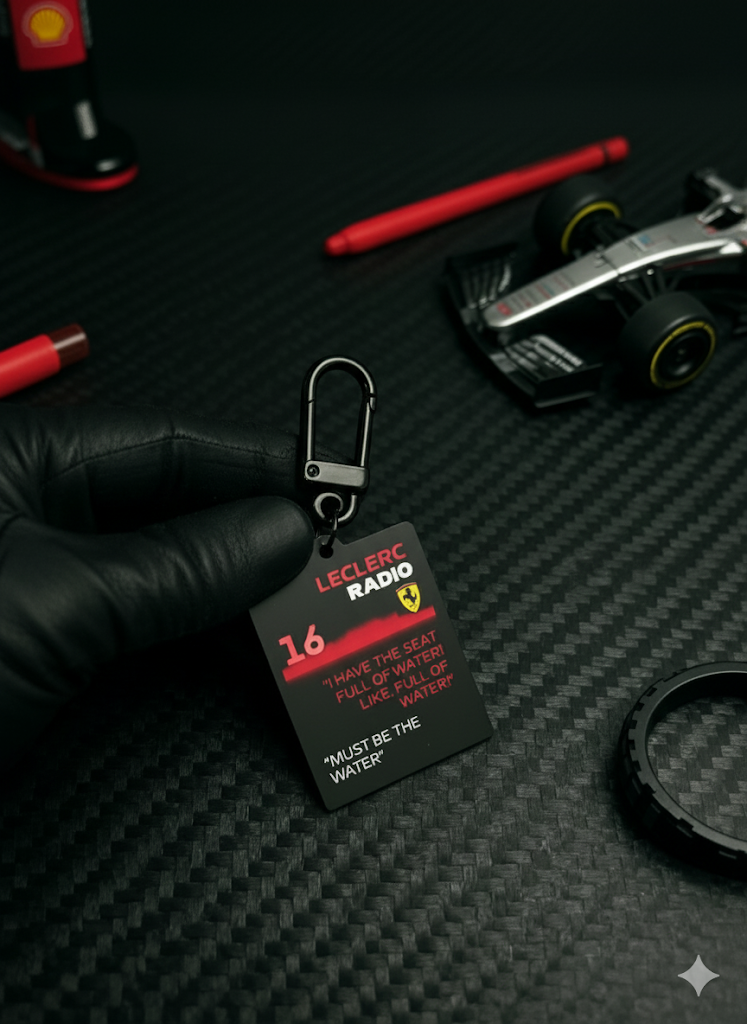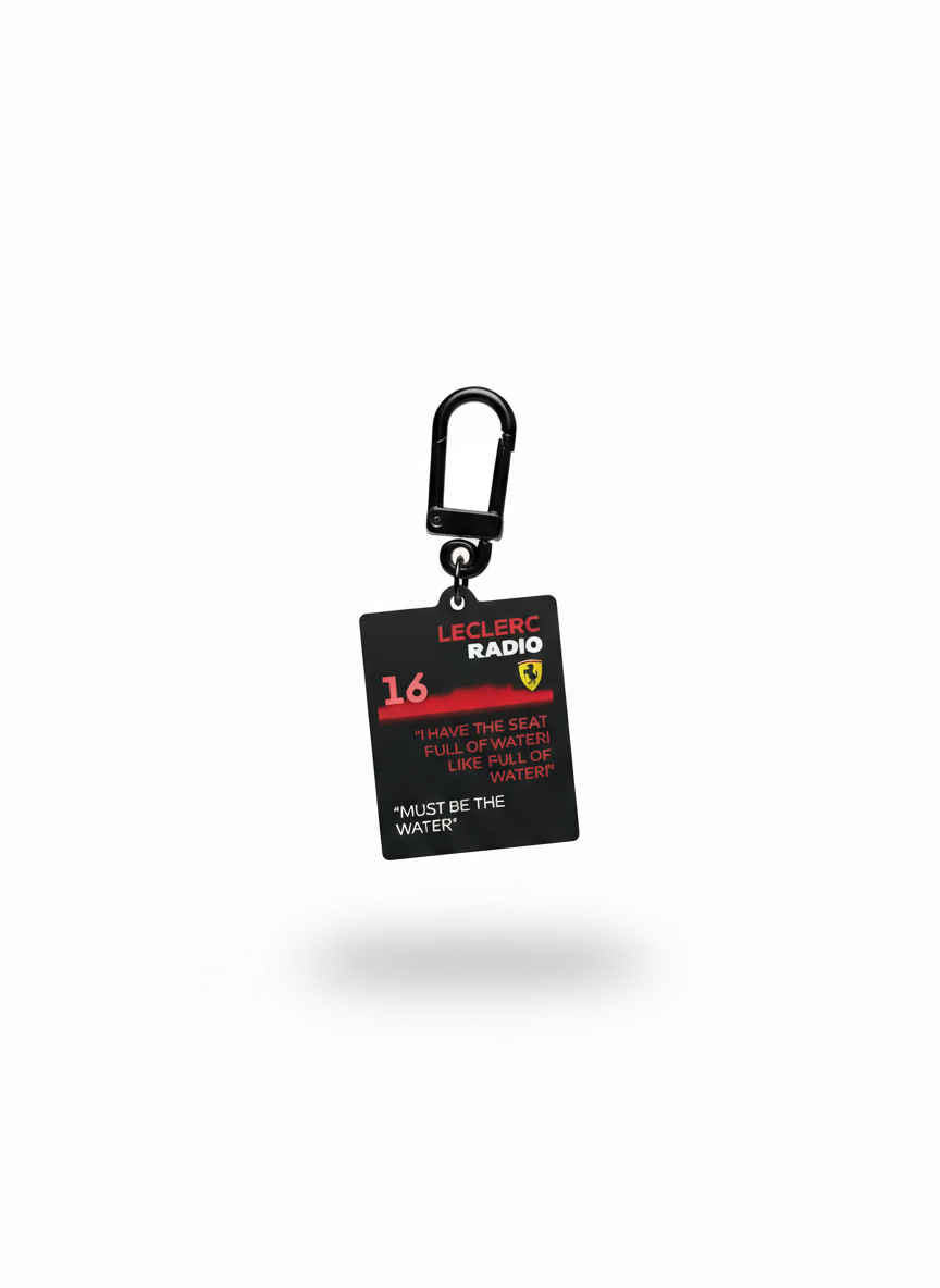Carry a slice of Ferrari radio legend. This metal keychain immortalizes Charles Leclerc’s now-iconic “Must Be The Water” exchange — the deadpan pit-wall reply that became an instant classic.