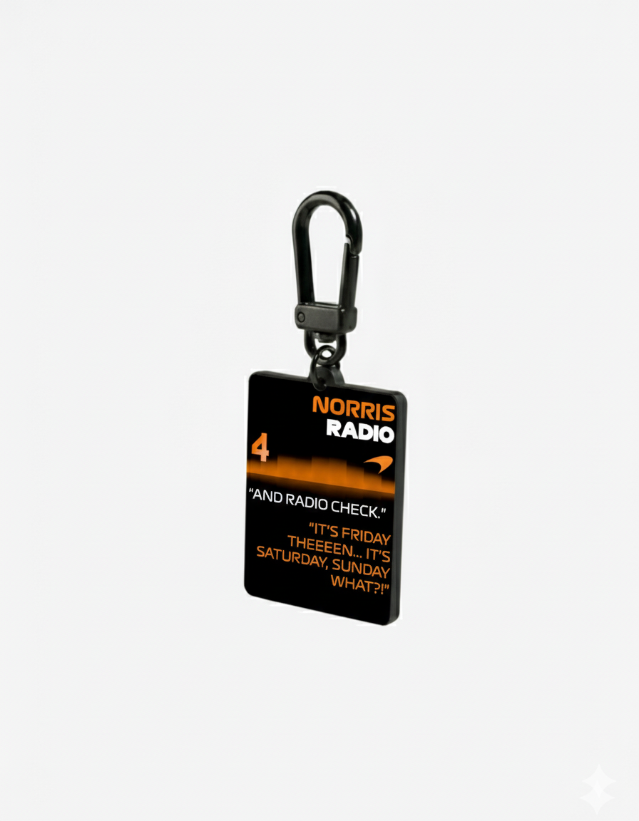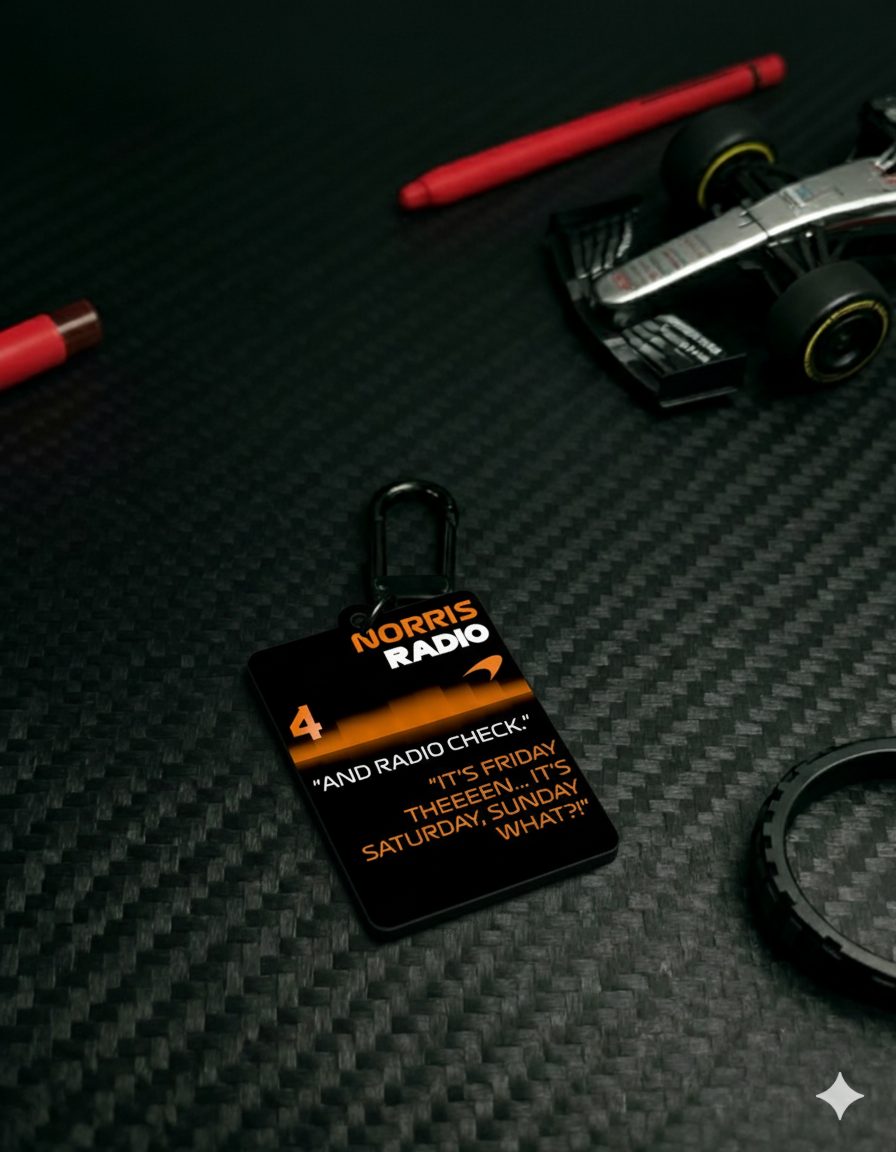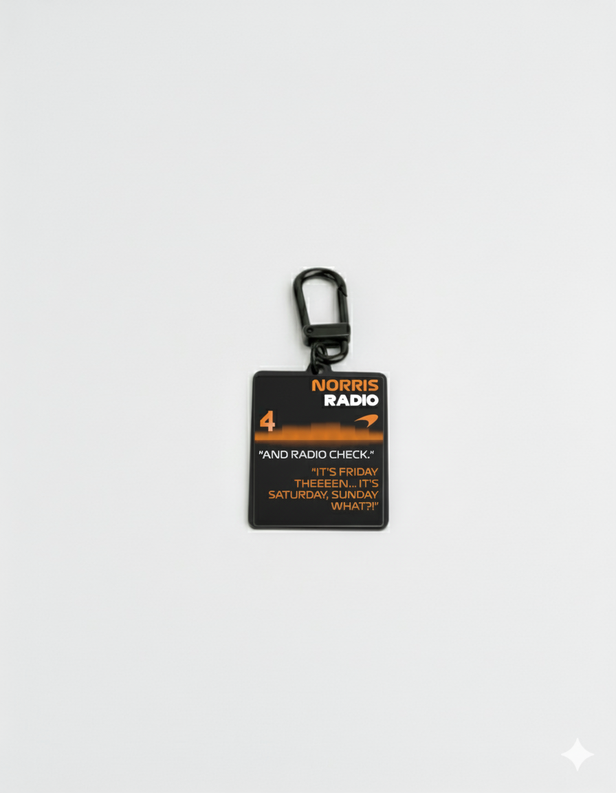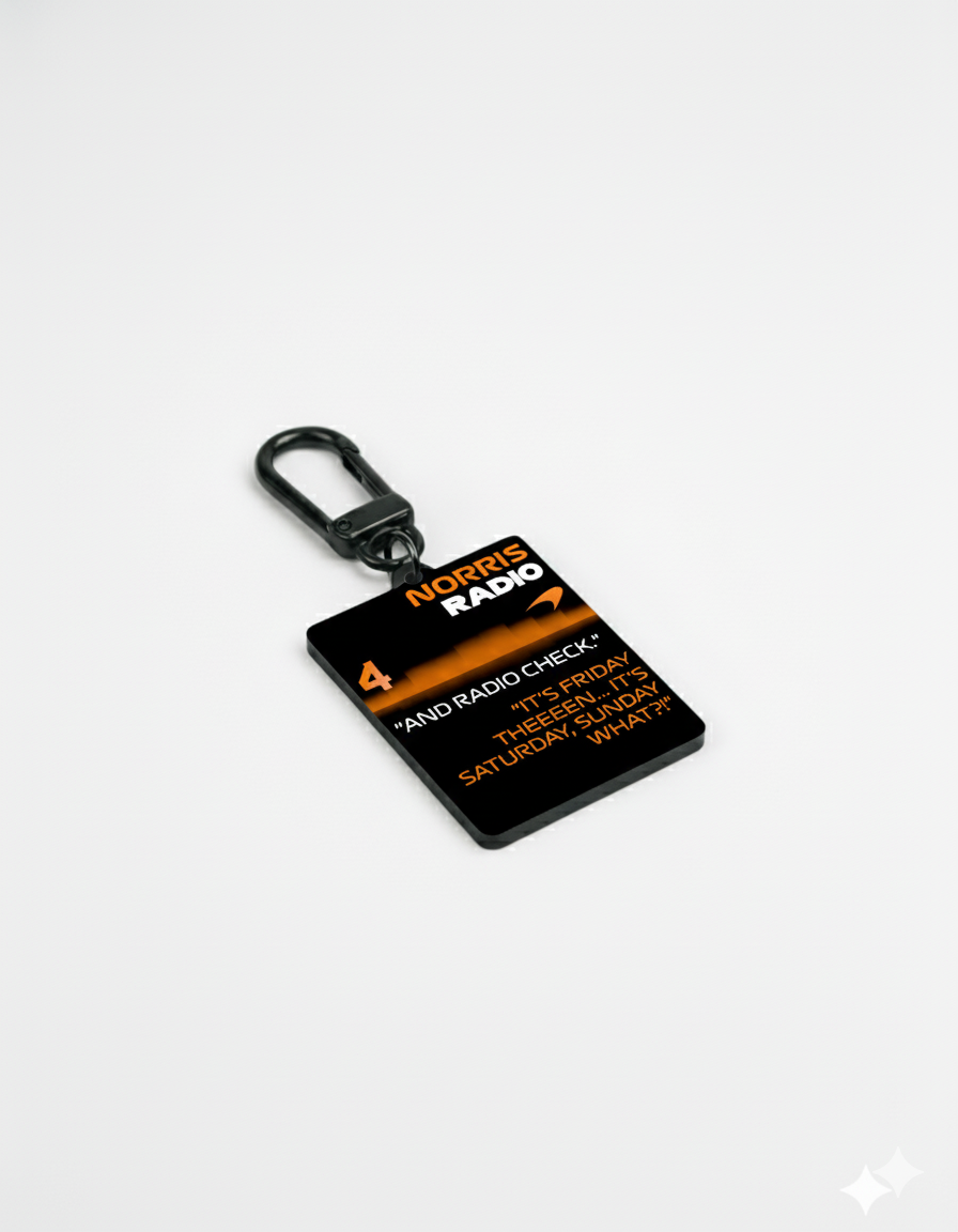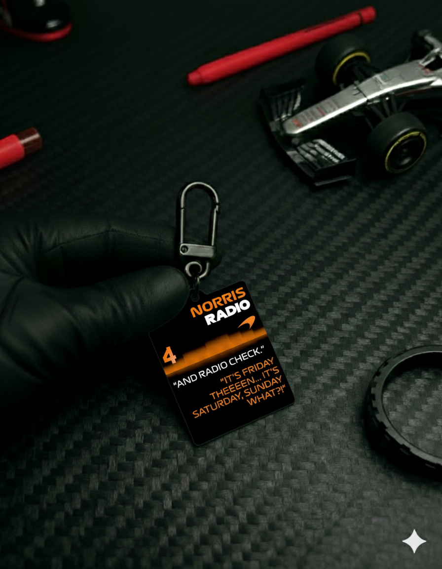 Celebrate McLaren spirit with this Lando Norris keychain quoting his cheerful “And radio check – It’s Friday then… it’s Saturday, Sunday what?!” radio moment.